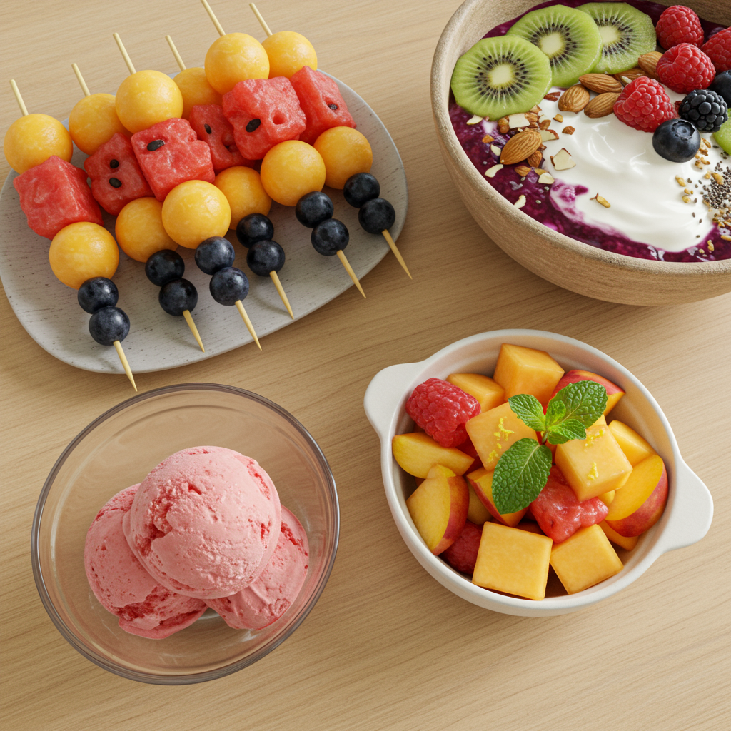 - 과일 샐러드: 다양한 제철 과일을 섞고, 레몬즙을 살짝 뿌려 상큼함을 더해보세요. 민트 잎을 곁들이면 향긋함이 배가됩니다.